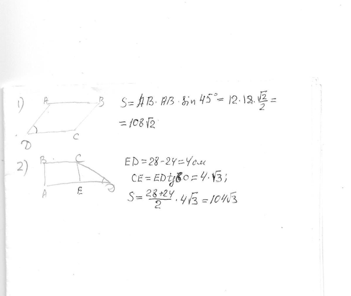 2.Найдите площадь прямоугольной трапеции с основаниями 24 см и 28 см и острым углом 60(градусов).