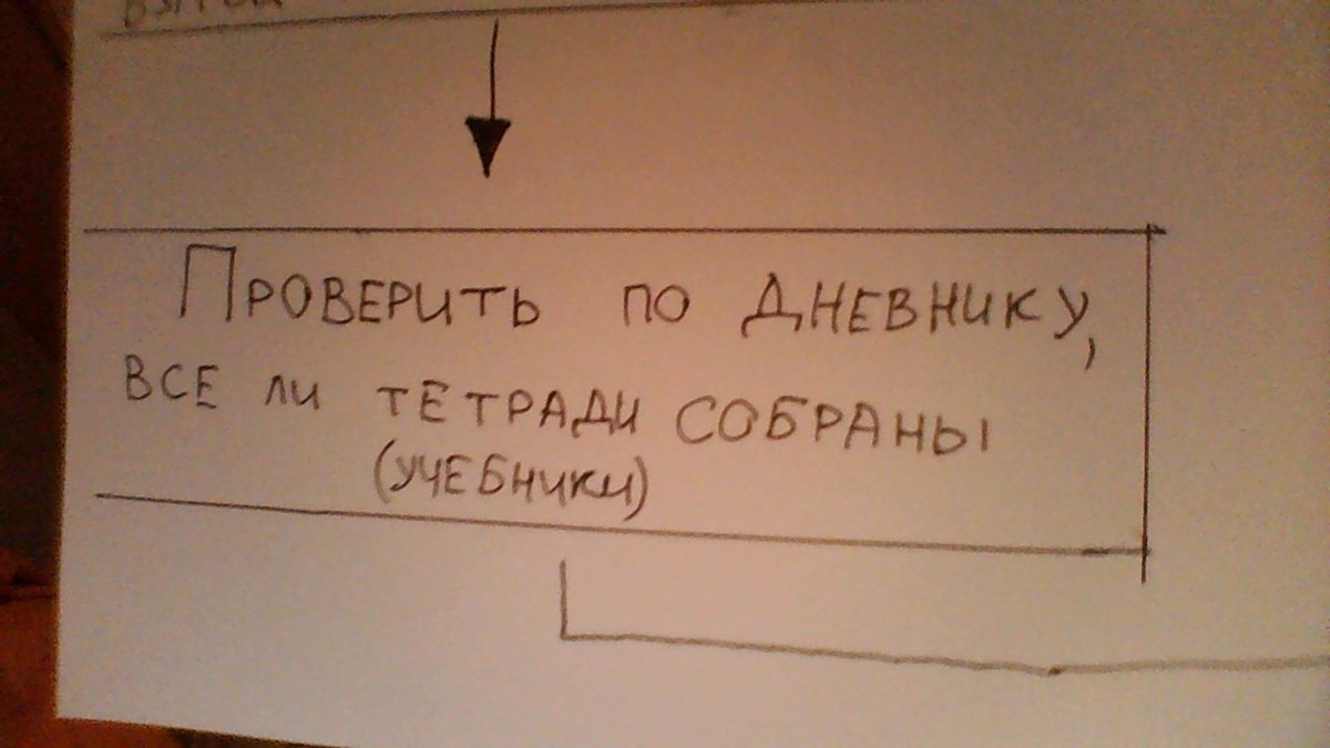 Достать необходимые учебники и тетради ----) сесть за свое рабочие место -----) открыть дневник и посмотреть, что задано ----) сделать все уроки.