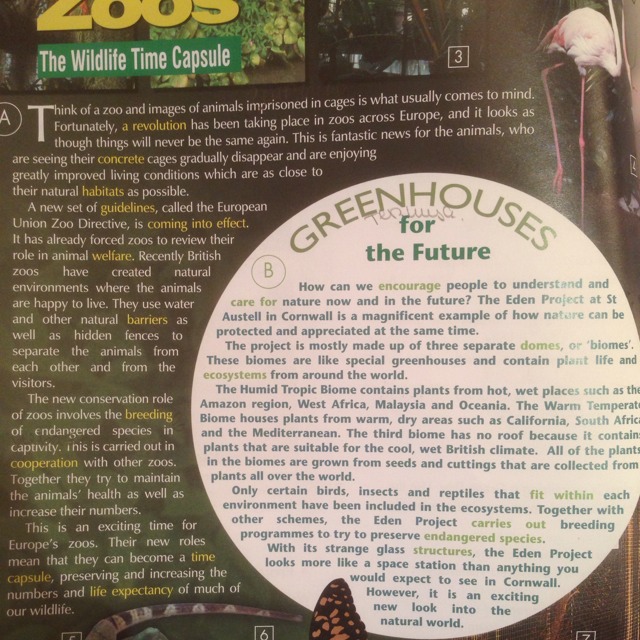 Подумайте о зоопарке и животных , заключенных в клетках является то, что обычно приходит на ум . К счастью, революция имел место в зоопарках по всей Европе , и это выглядит так, как будто вещи никогда не будет таким, как прежде . Это фантастическая новость для животных , которые видят, что их конкретные клетки постепенно исчезают и пользуются значительно улучшенные условия жизни , которые как можно ближе к их естественной среде обитания , как это возможно .Новый набор руководящих принципов , называется Директива Европейского союза зоопарк, вступает в силу . Это уже вынудило зоопарки пересмотреть свою роль в защите животных . Недавно британские зоопарки создали естественную среду , где животные счастливы жить . Они используют воду и другие естественные барьеры , а также скрытые заборы отделить животных от каждого и от посетителей .Новый сохранение роль зоопарков предполагает разведение исчезающих видов в неволе . Это осуществляется в сотрудничестве с другими зоопарками . Вместе они пытаются для поддержания здоровья животных , а также увеличить их количество .Это захватывающее время для зоопарков Европы. Их новые роли означает, что они могут стать капсула времени , сохранение и увеличение числа и продолжительности жизни большая часть дикой природы.Б.Как мы можем поощрять людей, чтобы понять и заботиться о природе в настоящее время и в будущем Проект Эдем в Санкт-Остелл в Корнуолле является великолепным примером того, как природа может быть защищен и ценили в то же время .Проект в основном состоит из трех отдельных куполов, или « биомов " . Эти биомы , как специальных теплицах и содержат растительную жизнь и экосистем со всего мира .Влажный Тропик Биом содержат растения от горячих , влажных местах, таких как в регионе Амазонки , в Западной Африке , Малайзии и Океании. Умеренно теплых биома дома растения из теплых, сухих областях, таких как Калифорния , Южной Африке и Средиземноморье. Третий биом нет крыши , потому что это содержит растения , которые подходят для прохладной , влажной британской климата . Все растениями в биомов выращивают из семян и резки , что собираются из растений по всему миру .Только некоторые птицы, насекомые и рептилии , которые вписываются в каждой среде были включены в экосистемах . Вместе с другими схемами ,проект Eden осуществляет селекционных программ , чтобы попытаться сохранить вымирающие виды .С его странных стеклянных конструкций ,проект Eden больше похож на космическую станцию , чем все, что вы ожидали бы увидеть в Корнуолле. Тем не менее, это захватывающее новый взгляд на мир природы.