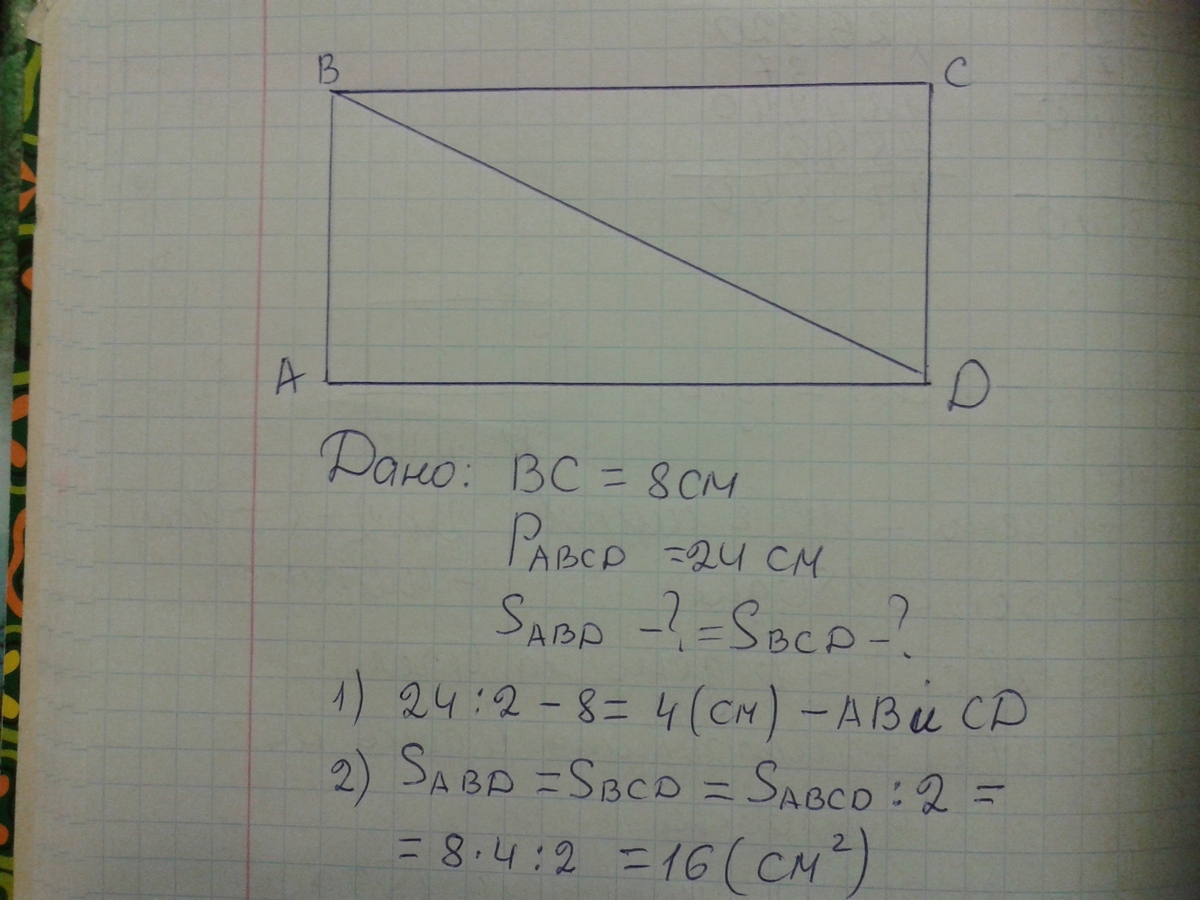Длина прямоугольника 8см,периметр 24 см. Начерти такой же прямоугольник,раздели его на 2 равных треугольника. Найди площадь каждого треугольника) Помогите с заранее Спасибо)
