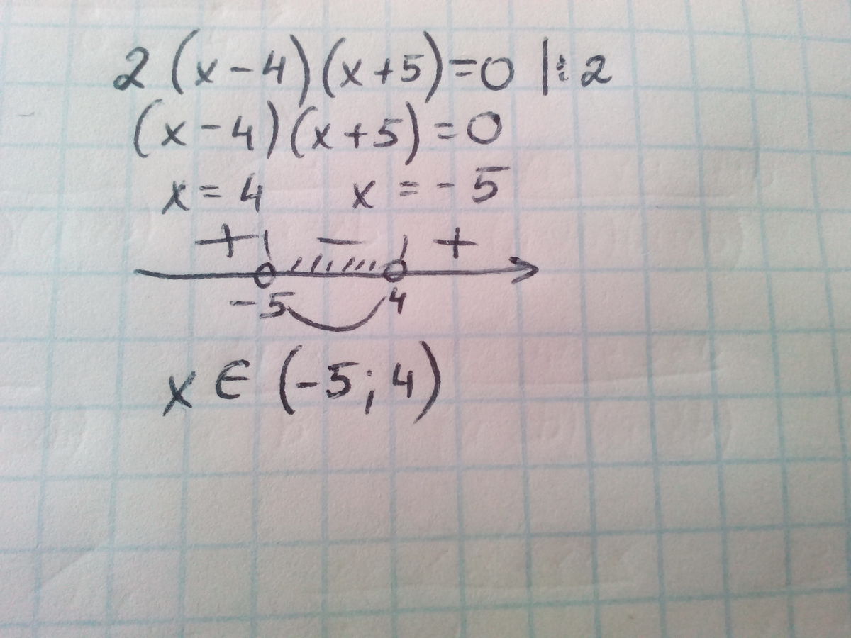 Решите неравенство 2(x-4)(x+5)<0 ,в ответ укажите длину промежутка , являющегося решением данного неравенства