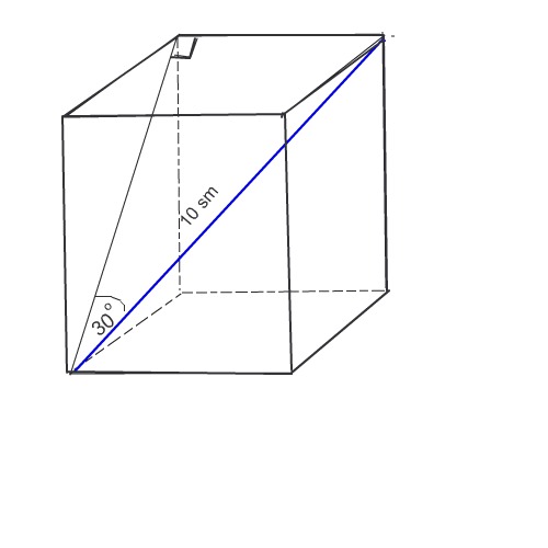 Так как сторона квадрата ( верхнего основания призмы) противолежит углу 30 градусов, она равна половине диагонали призмы и равна 5 см.