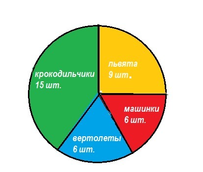 Вася собирает коллекцию "Киндер-Сюрпризов".Ему попалось 15 крокодильчиков ,9 львят, 6 машинок и 6 вертолетов. Построй и проанализируй круговую диаграмму