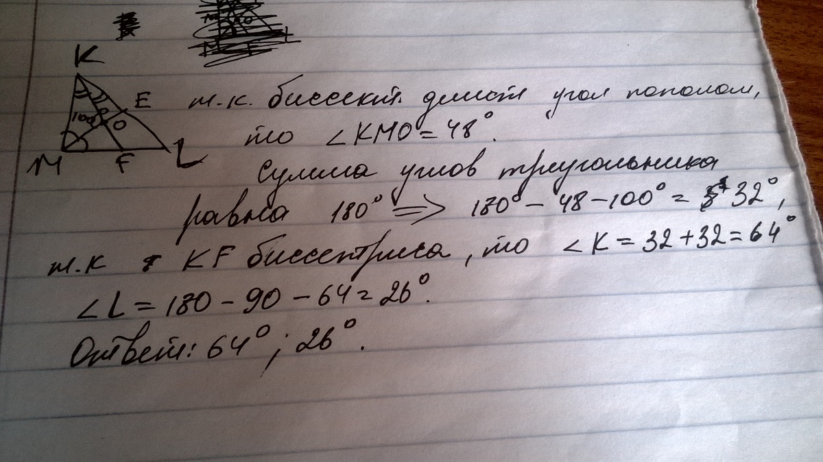 в прямоугольном треугольнике KLM угол М равен 90 градусов, биссектрисы ME и KF пересекаются в точке O. Угол KOM равен 100 градусам. Найти все острые углы треугольника KLM