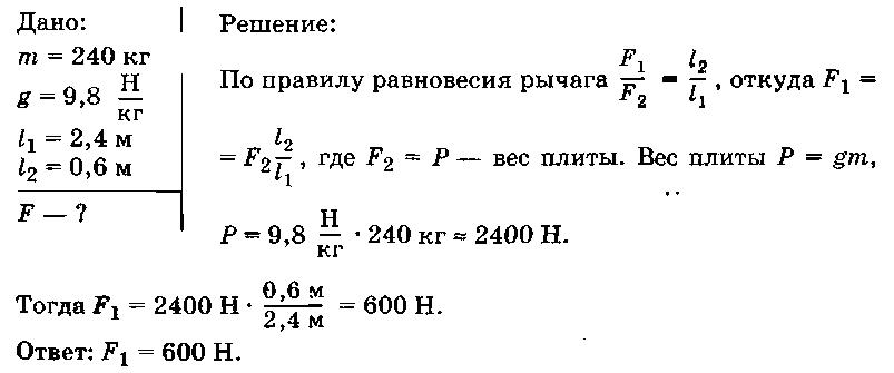 В нашем примере рабочий преодолевает силу 2400 Н, прикладывая к рычагу силу 600 Н. Он получает выигрыш в силе в 4 раза. Но при этом плечо, на которое действует рабочий, в 4 раза длиннее того, на которое действует вес плиты (l1 : l2 = 2,4 м : 0,6 м = 4).Применяя правило рычага, можно меньшей силой уравновесить большую силу. При этом плечо меньшей силы должно быть длиннее плеча большей силы.Посмотри, это не оно?