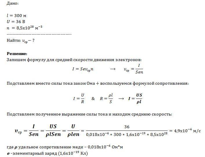 К концам медного проводника длиной 300 м приложено напряжение 36 В. Найдите среднюю скорость упорядоченного движения электронов в проводнике, если концентрация электронов проводимости меди 8,5⋅1028м-3