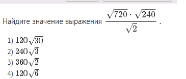 2) корень(720)*корень(240)/корень(2)=корень(120*120*2*6)/корень(2)=120*корень(6) ответ номер 4