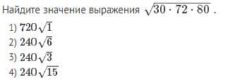 1) корень(30*72*80)=корень(10*10*8*8*3*3*3)=240*корень(3) ответ номер 3