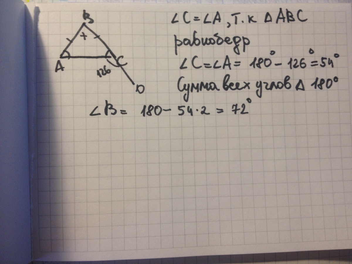 Биссектриса внешнего угла равнобедренного треугольника АВС при основании АС образует с основанием угол, величина которого равна 126°. Найдите величину угла АВС. Ответ дайте в градусах.