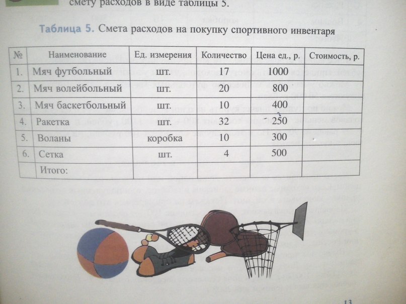 Составьте собственную смету для покупки трёх из перечисленных видов спортивного инвентаря на общую сумму 10 000 рублей.
