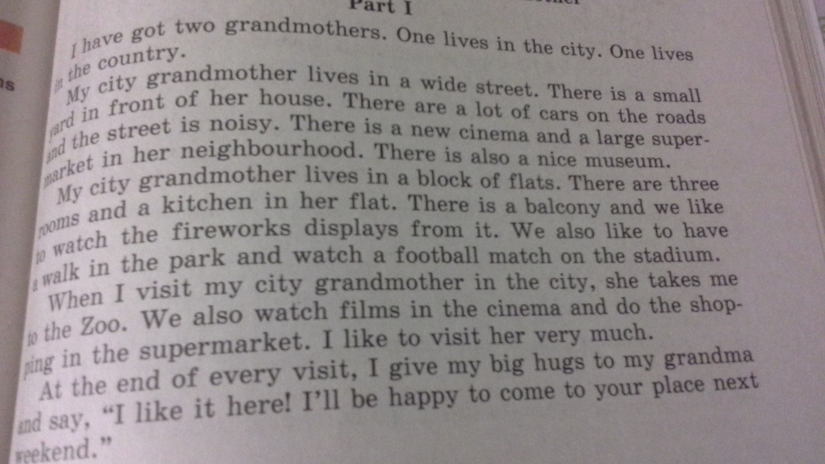 У меня есть две бабушки.Одна живет в городе,другая живет в деревне.Моя городская бабушка живет на широкой улице.Возле ее дома находится небольшой двор. на улице всегда много машин и очень шумно. по соседству находится новый кинотеатр и большой супермаркет.Также там есть хороший музей.Моя городская бабушка живет в квартире.В ее квартире 3 комнаты и кухня.Там есть балкон и оттуда мы любим смотреть салюты.Мы так же любим гулять в парке и смотреть футбольные матчи на стадионе.