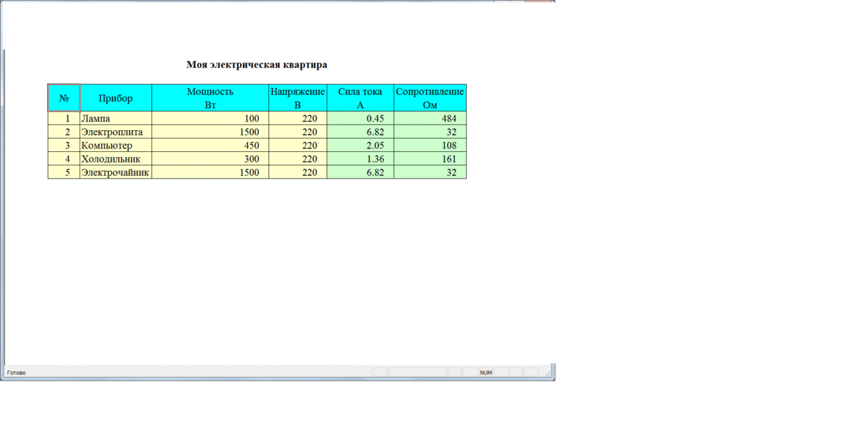 Прибор ... Мощность Вт ... Напряжение Вольт ... Сила тока А ... Сопративление Ом