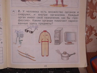 Ногам(лыжи),мозгу(компьютер), телу(костюм),желудку(кастрюля)