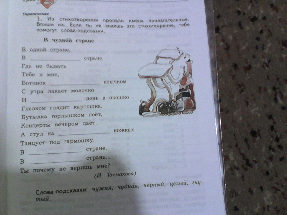 прашу помогите из стихотворения пропали имена прилагательные спиши их если ты не знаешь это стихотворение тебе помогут слово подсказки чудной стране название стихотворения в одной стране в ничего нету стране где не бывать тебе и мне ботинок ничего нету язычком с утра лакает молочко и ничего нету день в окошко glazkom глядит картошка бутылка горлышком поет концерты вечером дает aston а ничего нету ножках танцует под гармошку в ничего нету стране в ничего нет в стране ты почему не веришь мне все а вот слово подсказки 1 чужая 2 чудное 3 черный 4 целый 5 глупый они не по порядку