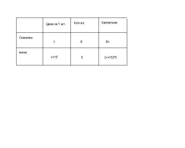 такие задачи удобно решать табличкой. первый столбик будет цена за одну штуку, второй столбик - количество и третий столбик - заплатили. первая линееечка скакалки, вторая - мячи. сказано что мяч дороже скакалки, а за х всегда берут меньшее число. так как мяч дороже значит скакалка дешевле. значит скакалка х а мяч х+15. известно что скакалок купили 8 значит надо 8*х (восемь на икс), а мячей купили 5 значит (х+15)*5 х+15 обязательно бери в скобки! а так как известно сто заплптили поровну получается уравнение: