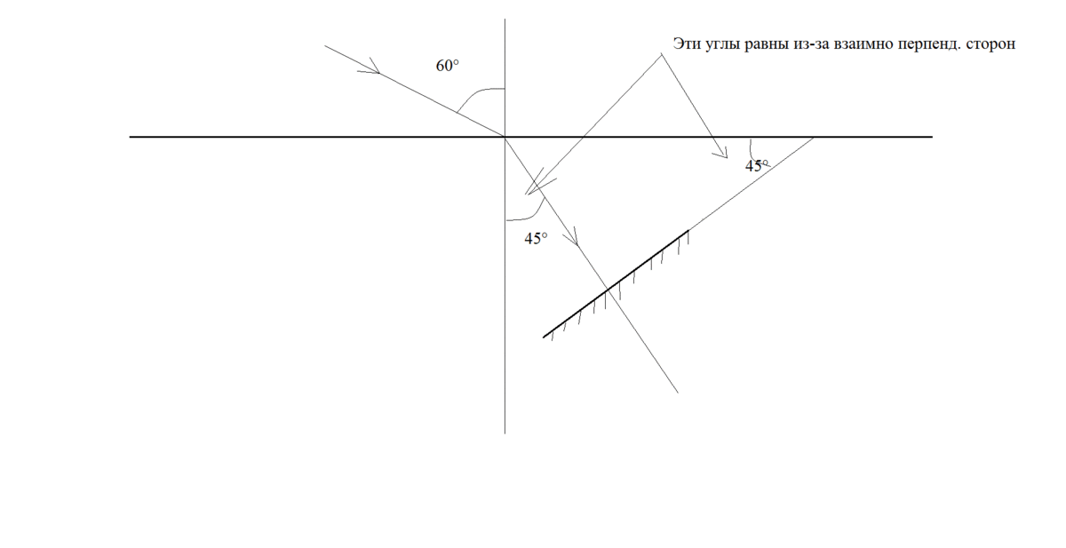 Угол падения узкого пучка света на поверхность жидкости равен 60°, а угол преломления 45°. Под каким углом к горизонту следует разместить в жидкости плоское зеркало, чтобы отраженный пучок возвратился к источнику света? Помогите,срочно! (желательно с рисунком и дано)