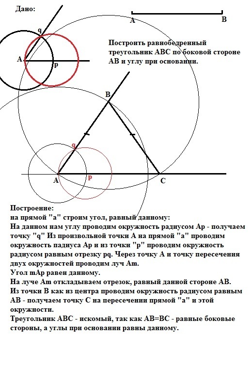 1. Построение: на прямой "а" строим угол, равный данному: На данном нам углу проводим окружность радиусом Ар - получаем точку "q". Из произвольной точки А на прямой "а" проводом окружность радиуса Ар и из точки "р" проводим окружность радиусом равным отрезку рq. Через точку А и точку пересечения двух окружностей проводим луч Аm. Угол mАр равен данному. На луче Аm откладываем отрезок, равный данной стороне АВ. Из точки В как из центра проводим окружность радиусом равным АВ - получаем точку С на пересечении прямой "а" и этой окружности. Треугольввк АВС - искомый, так как АВ=ВС - равные боковые стороны, а углы при основании равны данному.