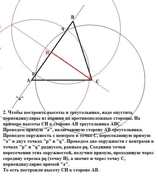 Проведем прямую "а", включающую сторону АВ треугольника. Проведем окружность с центром в точке С, пересекающую прямую "a" в двух точках "p" и "q". Проведем две окружности с центрами в точках "p" и "q" радиусом, равным pq. Соединив точки пересечения этих окружностей, получим прямую, проходящую через середину отрезка pq (точку Н), а значит и через точку С (так как точка С равноудалена от точк "p" и "q" по построению), перпендикулярно прямой "а".