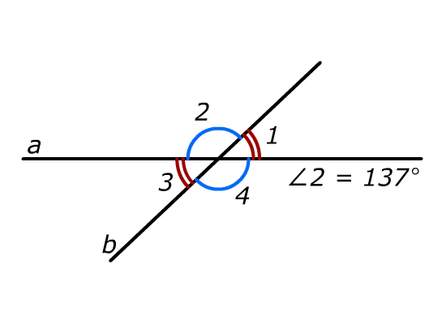 На рисунке изображены две пересекающиеся прямые a и b и задана величина одного из углов. Найдите величины остальных углов.