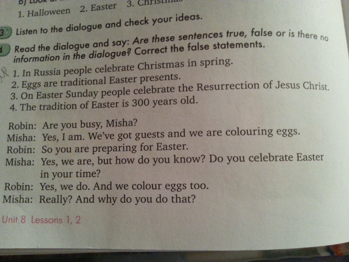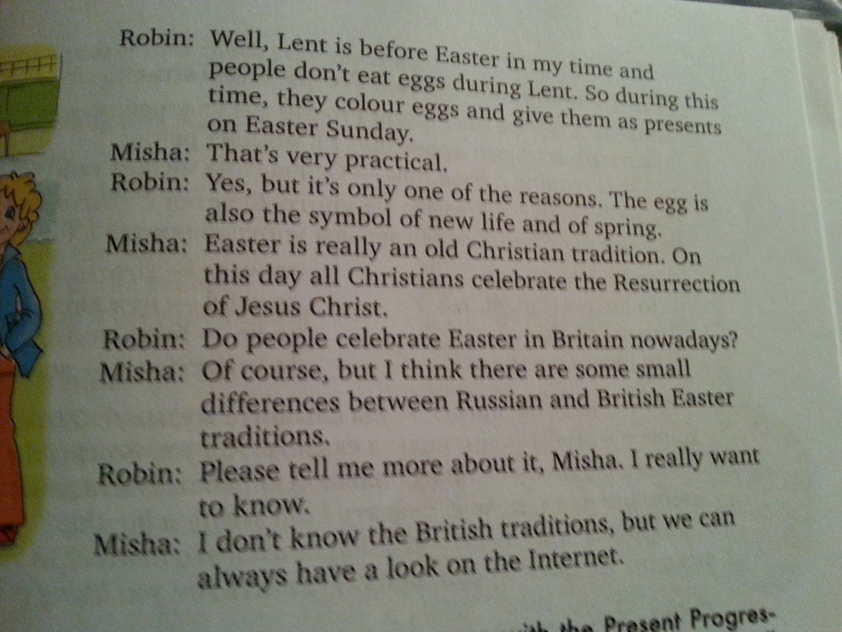 Misha : Пасха это действительно старая христианская традиция. В этот день все христиане празднуют воскресенье Иисуса Христа.
