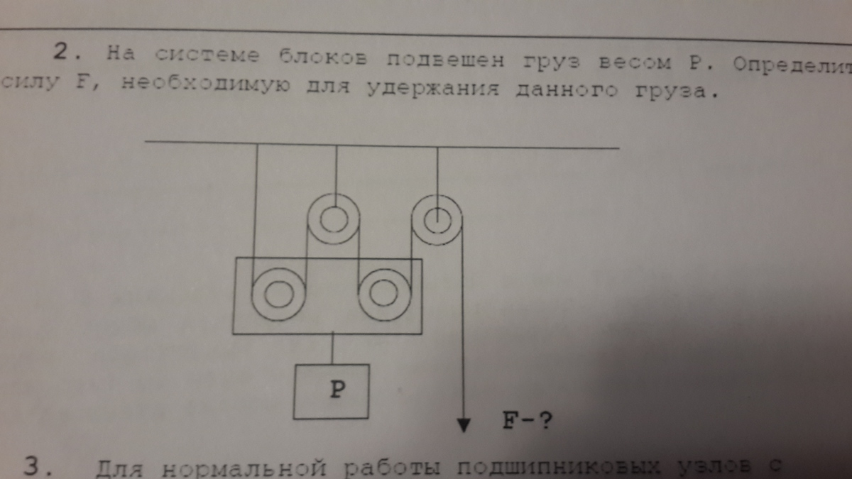 F=P/8 т.к. подвижный блок даёт выигрыш в силе в 2 раза, а таких блоков - 4.