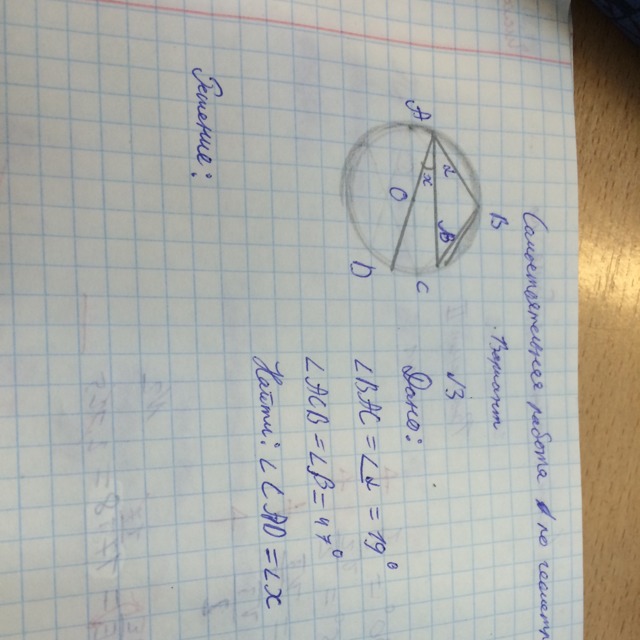 Решаем через дуги. По свойству вписанных углов дуга АВ + дуга ВС = 2*(угол альфа + угол бета)=> дуга АС = 132 градуса. Т к АД -диаметр, то дуга СД = 180 - дуга АС= 180-132=48. Угол х равен 1/2 дуги СД=> угол х = 24