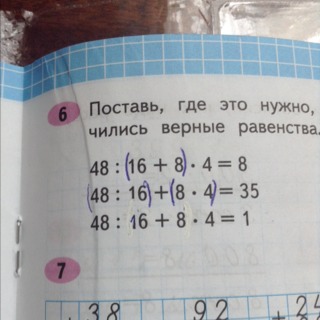 Где надо поставить скобки в этом примере плиз помогите:48:16+8•4=1.помогите с домашним заданием:(