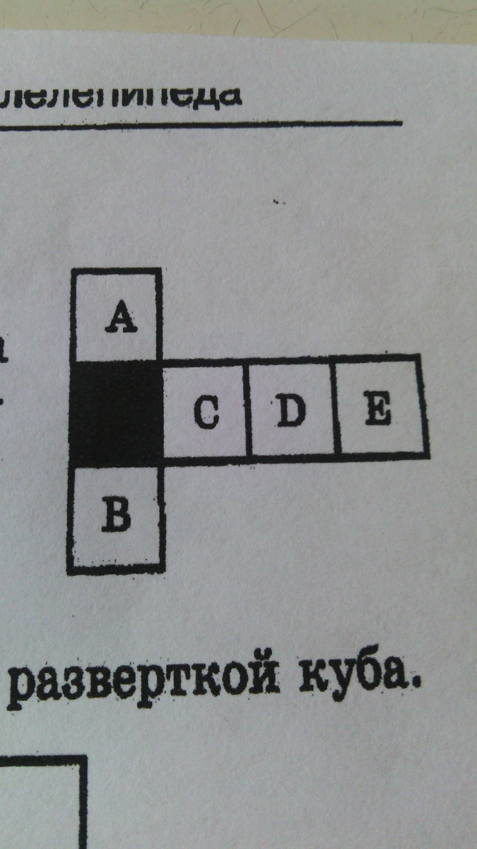 На рисунке изображена развертка куба. Определите, какой буквой обозначена верхняя грань, если нижняя грань закрашена.