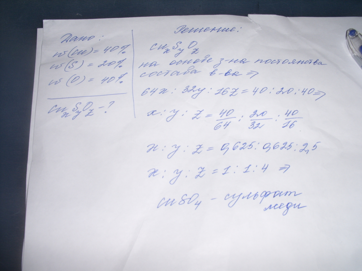 CuSO4, т.к. возьмем 100 г этого вещества, тогда масса меди будет 40 г, масса серы 20 г, масса кислорода 40 г. Найдем количества вещества каждого элемента: