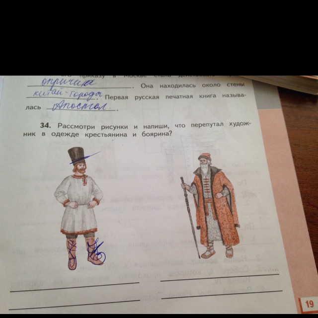 Рассмотри рисунки и запиши, что перепутал художник в одежде крестьянина и боярина? Помогите с названиями одежды
