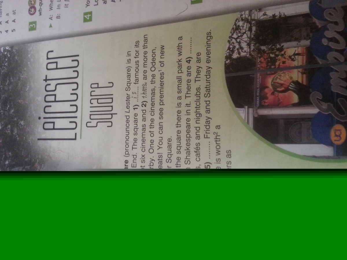 Лестер-Сквер находится в Зададной части Лондона. Площадь известна своими кинотеатрами. Здесь находятся 6 кинотеатров и больше 50 театров поблизости. Один из кинотеатров, Одеон , имеет 1700мест! Вы можете увидеть премьеры новых фильмов на площади Лестер-Сквер.