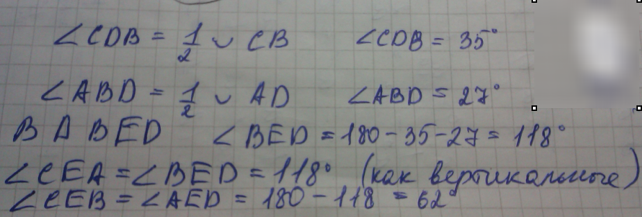 хорды АВ и CD окружности пересекаются в точке E . найти угол BEC, если дуга AD= 54 градуса,дуга BC =70 градусов.