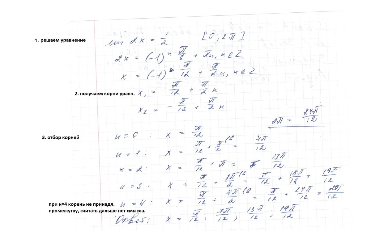 Найдите все корни уравнения sin2x=1/2, принадлежащие отрезку [0;2п]