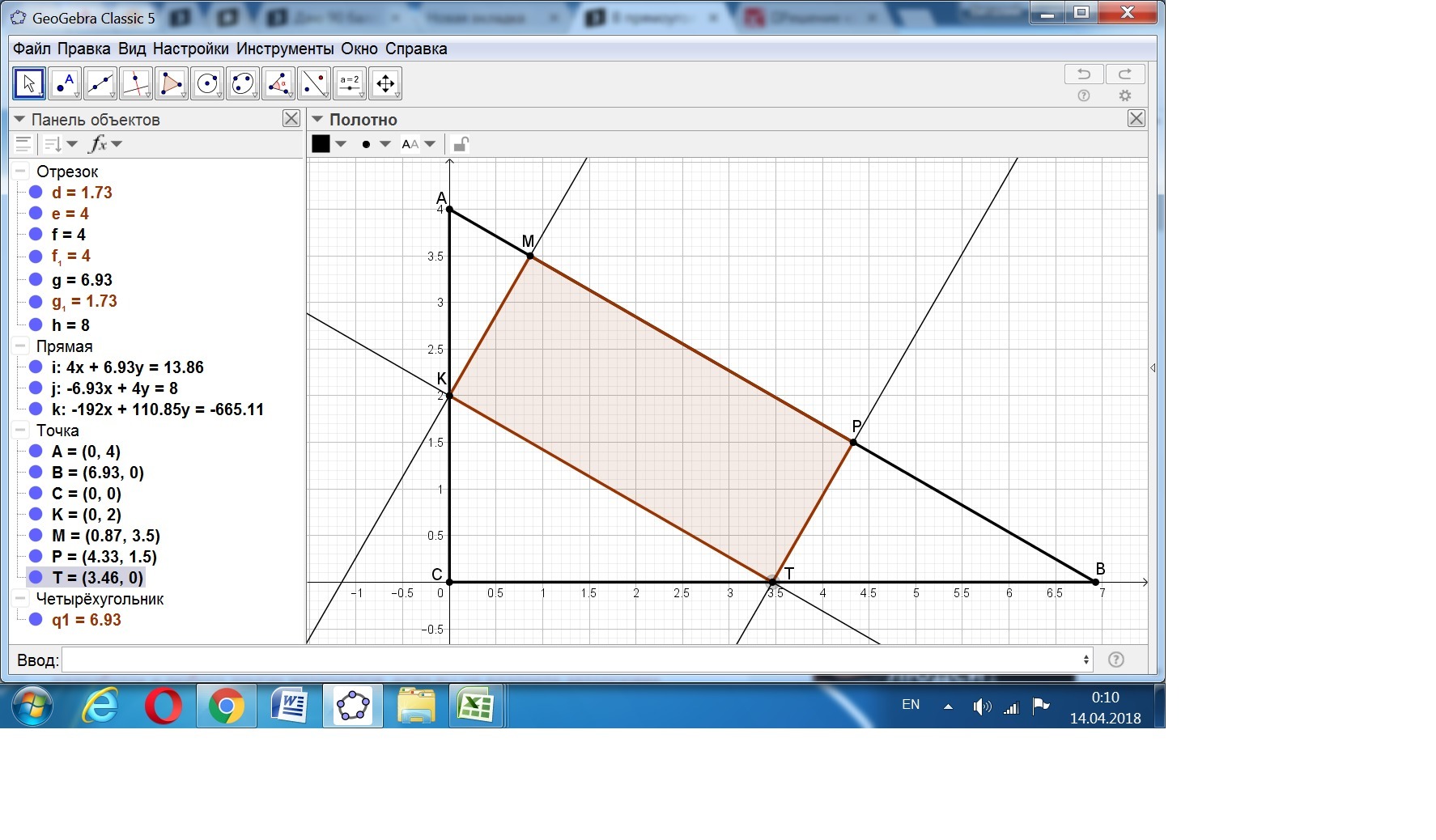 Дан прямоугольный треугольник АВС с гипотенузой АВ = 8 см и углом А = 60 градусов, в который вписан прямоугольник КМРТ так,что одна из его сторон лежит на гипотенузе.