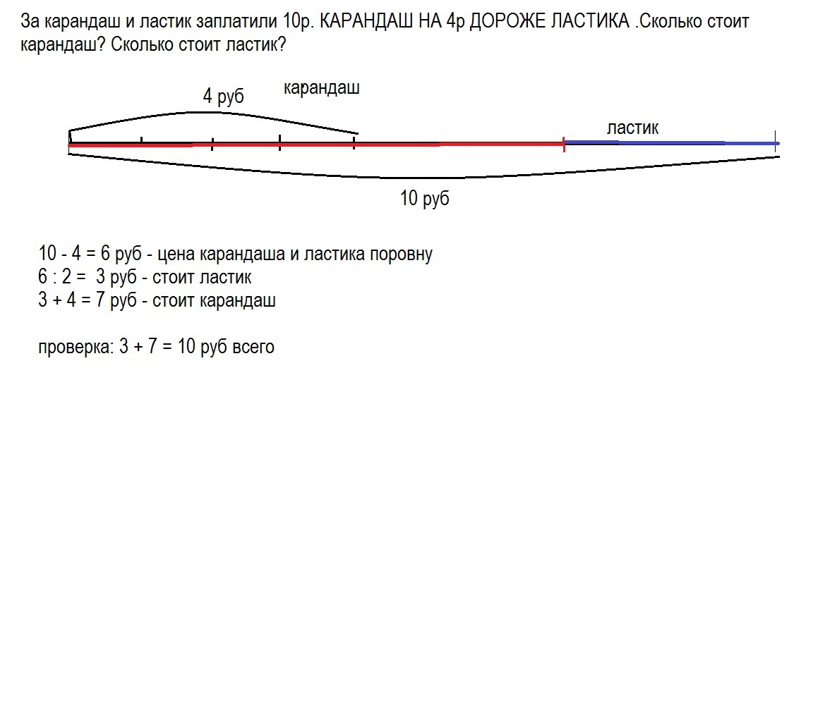 За карандаш и ластик заплатили 10р. КАРАНДАШ НА 4р ДОРОЖЕ ЛАСТИКА .Сколько стоит карандаш? Сколько стоит ластик? Задача 1 класс