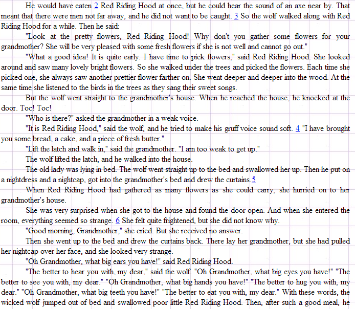 1) Mother. 2) Red Riding Hood. 3) The wolf. 4) Red Riding Hood. 5) Grandmother. 6) The hunter.