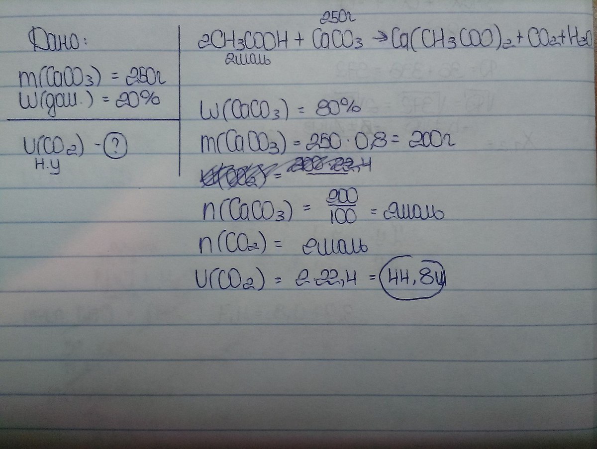 вычислите объем углекислого газа(н.у), который образуется при растворении в уксосной кислоте 250 г известняка, содержащего 20% примесей. можно пожалуйста с дано