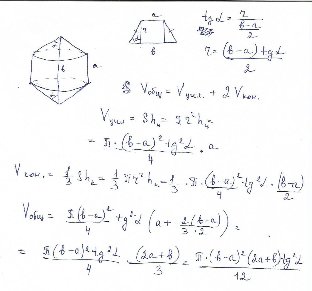 Равнобокая трапеция с основаниями a и b(a<b) и острым углом α вращается вокруг большего основания. Найдите объем тела вращения.
