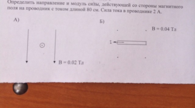 1) сила ампера будет направлена на нас перпендикулярно силовым линиям (стрелкам). l=0,8м, альфа=90 гр, F ампера =BI(сила тока) l (длину) sin альфа= 0,02Тл * 2 A* 0,8 м= 0.032Н