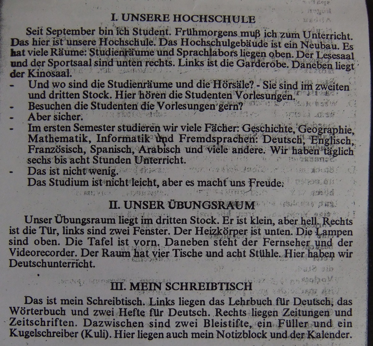Это мой письменный стол. Слева учебник немецкого, словарь и две тетради для немецкого. Справа газеты и журналы. Между лежат два карандаша, ручка самописка и шариковая ручка. Здесь так же есть блокнот и календарь.