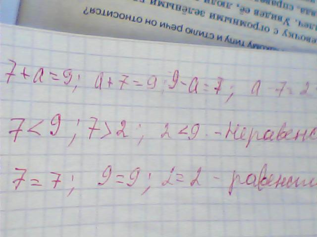 7 <9 7> 2 7=7 7+а=9 а+7=9 9=9 2=2 2 <9 9-а=7 а-7=2 Запиши в первый столбик уравнения, во второй неравенства, а в третий равенства. Реши уравнения.