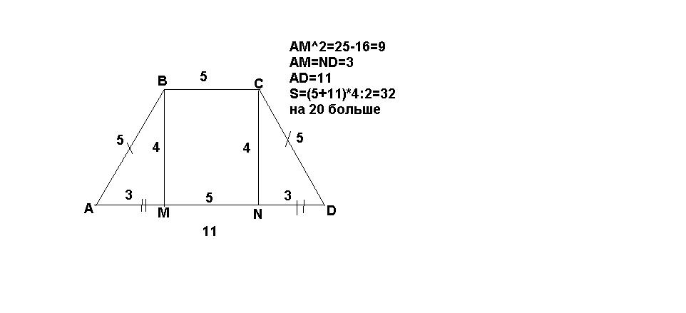 в трапеции ABCD меньшее основание ВС=5, а боковые её стороны АВ=СD=5. Высота равна 4. Насколько площадь трапеции больше 12. побыстрее плиз)