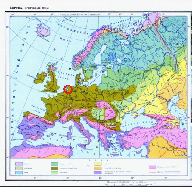Если посмотреть на карту природных зон, которая дана ниже в приложении, то можно увидеть, что Нидерланды расположены в зоне широколиственных лесов.