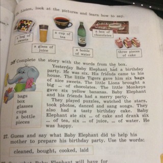 Вчера у Слоненка было день рожденитам где пропуски надо вставить:bar, piece, glasses, glasses, a glass