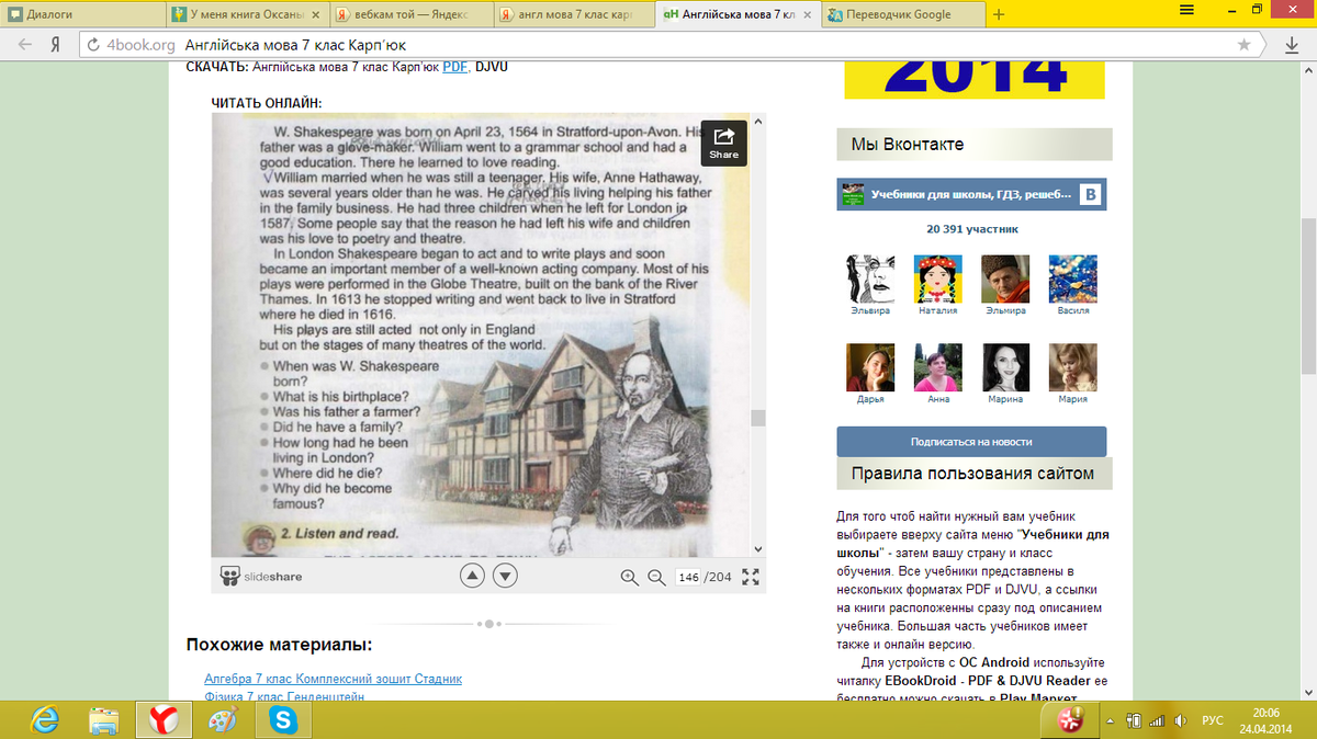 У меня книга Оксаны Карпьюк мне нужен перевод стр 149 про Шекспира