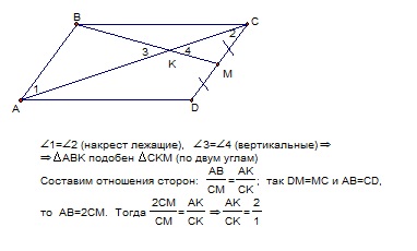 В параллелограмме АВСД отмечена точка М-середина отрезка СД. Отрезок ВМ пересакется с диагональю АС в точке К. Докажите, что АК:СК=2:1