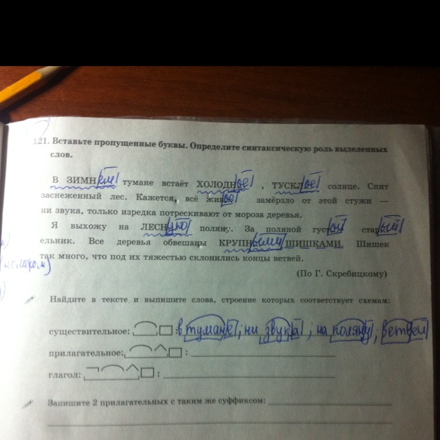 прилаг.:зимнем(зимн -корень,н-суф.,ем окончание),холодное (холод-корень,н-суф.,ое-окончание)лесную(лес-корень,н-суффикс,ую-окончание)
