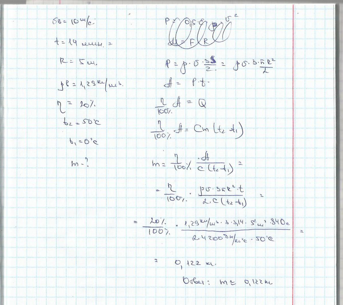 Какую массу воды можно нагреть от 0 °С до 50 °С ветродвигателем, колесо которого имеет радиус 5 м, за 14 мин работы при скорости ветра 10 м/с? Ветродви¬гатель вращает лопасти мешалки, с помощью которой его механическая энергия превращается во внутрен¬нюю энергию воды. КПД установки 20%. Плотность воздуха 1,29 кг/м3. Удельная теплоемкость воды равна 4200 Дж/кг ∙ °С.