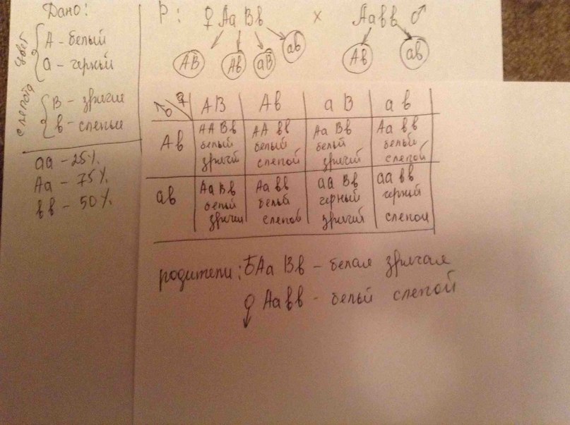 Ген белой пушнины у соболя является доминантным. Рецессивный ген(а) соответствует черной масти. Соболи могут быть слепыми под воздействием рецессивного гена (b). Зрячая самка от слепого самца родила 50% слепых, 25% черных и 75% белых детенышей. Проанализируйте родительские организмы по фенотипу и генотипу и составьте схему скрещивания