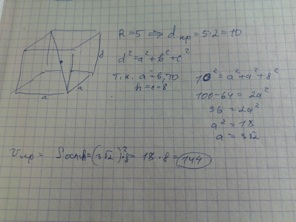 Радиус шара 5см. В шар вписана правильная четырех угольная призма высотой 8 см. Найдите обьем призмы.